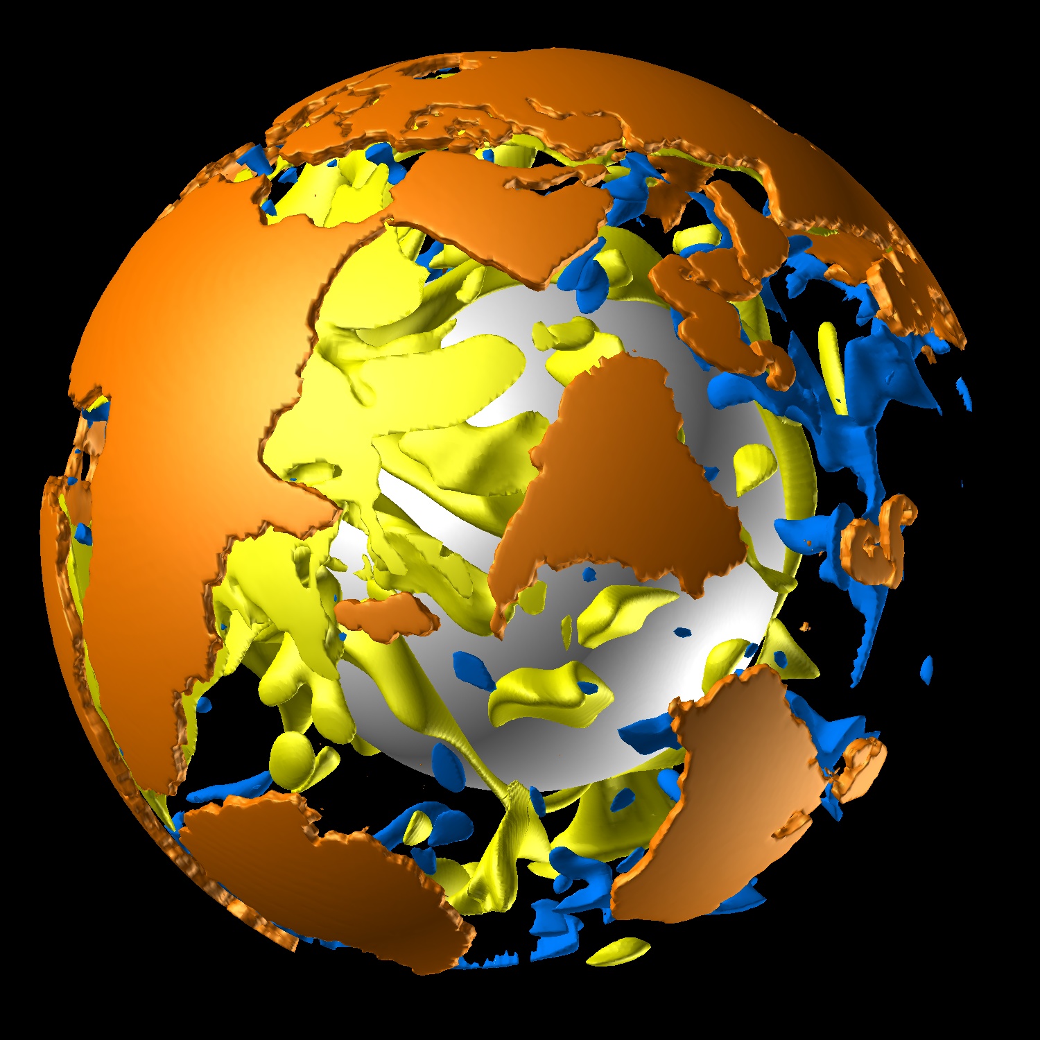 | Yoshida and Hamano (2015, Scientific Reports, doi:10.1038/srep08407)の「Model C30」に基づく。2億年前から現在までに相当する時間のマントル対流の温度場と大陸配置の時間変化(動画の最初が2億年前、最後が現在)。青色の等値面は各深さの平均温度よりも250℃低く、黄色の等値面は各深さの平均温度よりも100℃高い。表層のオレンジ色の部分は大陸の位置、中心の白色の球はコア・マントル境界を表す。インド亜大陸が超大陸から分裂して高速で北上し、やがてユーラシア大陸に衝突する様子が再現されている。 | |