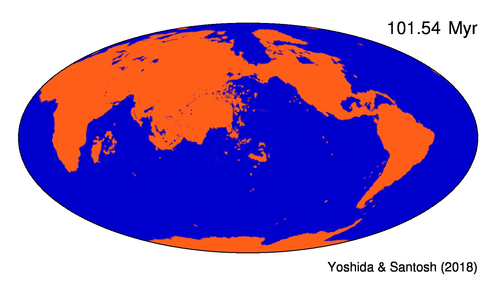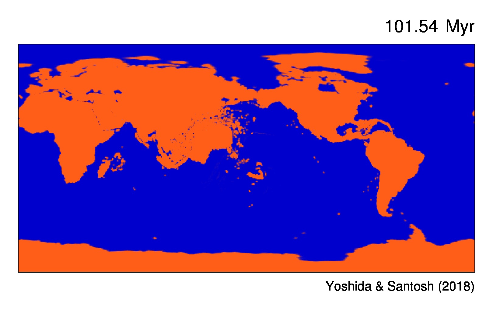 | 現在から3億年後までの大陸移動とマントル対流の時間変化の三次元プロット(Yoshida and Santosh, 2018)。表層の茶色の領域が大陸。マントル内部の青色と黄色の等値面は、それぞれ各深さの平均よりも300℃低温、高温であることを示す。中心の赤色の領域(球面)はマントルの底面(深さ約2900 kmのコアとマントルの境界)を示す。現在の地球のプレート運動データはArgus et al. (2011)、上部マントルのスラブモデルは「SLAB1.0」 (Hayes et al., 2012)、下部マントルの温度異常は全球S波トモグラフィーモデル「S40RTS」 (Ritsema et al., 2011)に基づく。 | |
