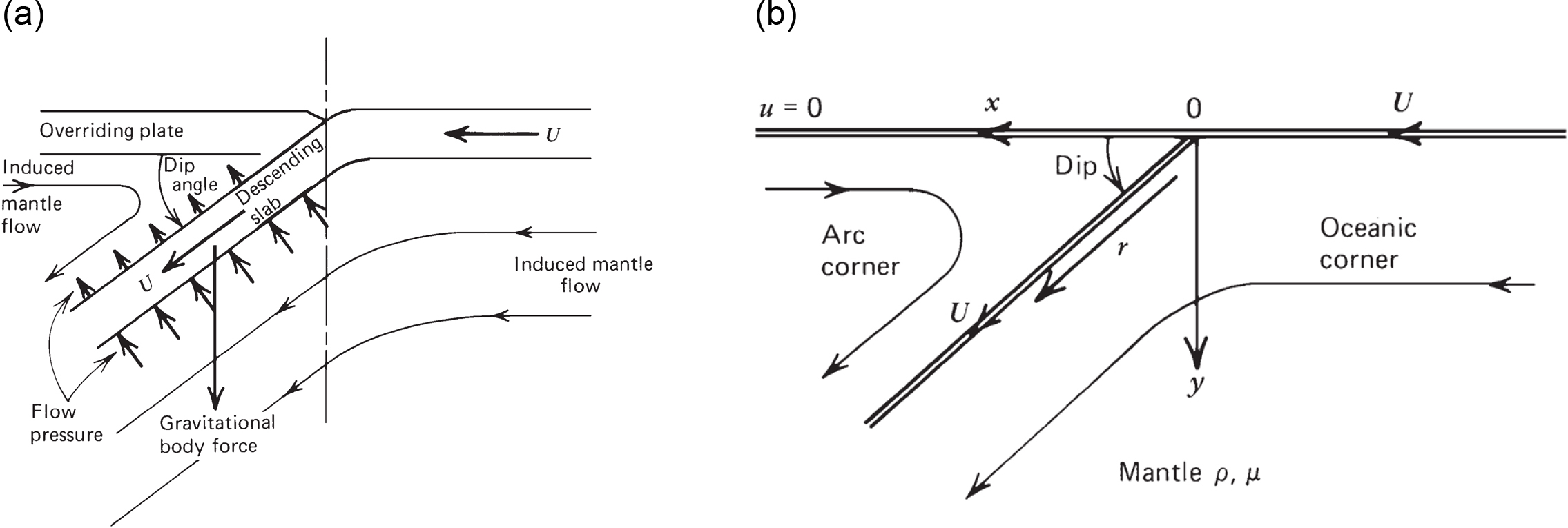 図1.マントルの粘性コーナー流モデル(Turcotte and Schubert, 2014)。左側の上盤プレートの下に右側からもう一方のプレートが速度Uで沈み込んでいる。(a)沈み込み帯でのマントルの流れの概略図。(b)解析のために(a)を模式化した図.Arc cornerを「弧側コーナー」、Oceanic cornerを「海側コーナー」、沈み込みプレートの傾斜角(dip)をθ、「海溝点」をx=0、y=0の位置、「沈み込み線」を海溝点から傾斜角θをもって上盤プレート側に伸びる線とする。