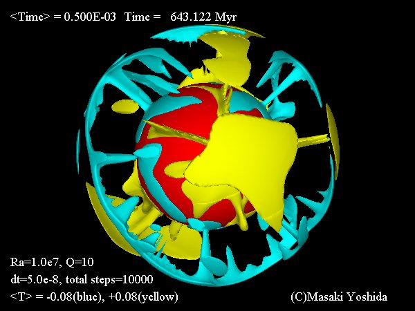 | 無次元温度0.5の等温度面(緑色)。 | 黄色と緑色の等値面は各深さでの平均温度との差(温度異常、δT)を表す。 黄色はδT=+0.08、水色はδT=-0.08。中心の赤い球はコアの位置。 |