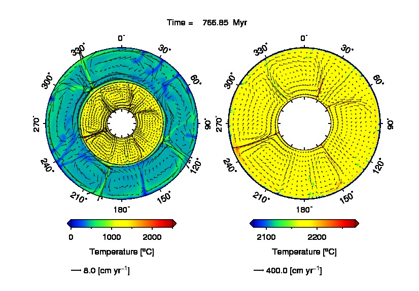 | マントルの加熱源として下面加熱と内部発熱の両方が存在する場合のマントル対流。レイリー数は107。左は、マントル内の放射性元素の壊変による内部発熱量が現在の地球マントルの値(3.50×10-12 W/kg)の場合。右は、内部発熱量が30億年前(太古代)の地球マントルの値(1.30×10-11 W/kg)の場合。内部発熱量が大きいほど、マントルの平均温度と上昇プルームの温度の差が小さくなり、下降プルームが卓越するようになる。 | |