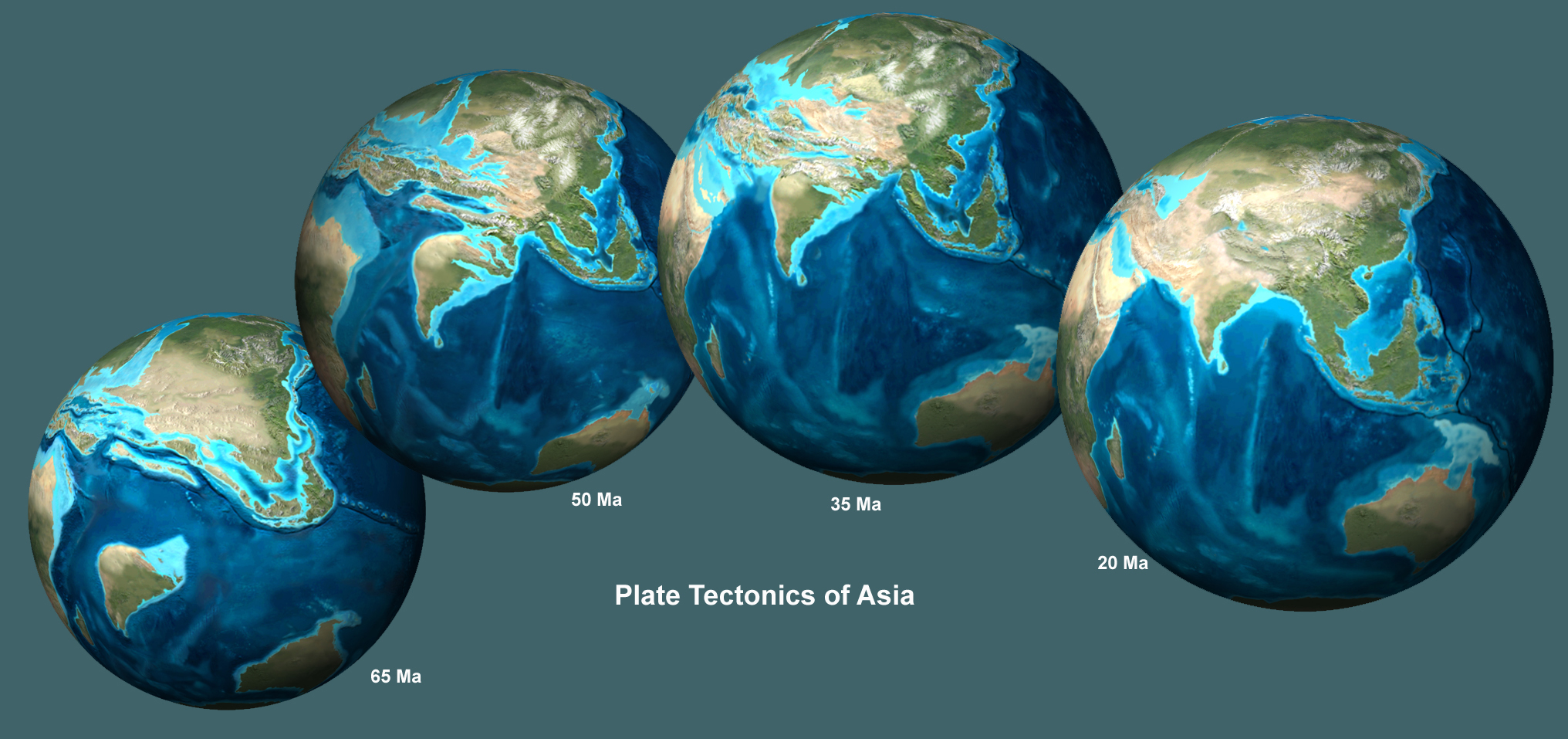 超大陸パンゲアが分裂し、現在の地球の六大陸が形成される過程で顕著なイベントの一つは、パンゲアの南半分を構成していたゴンドワナ大陸の一部であったインド亜大陸がテーチス海を高速で北上してユーラシア大陸に衝突し、現在もなお北上を続けていることである(図3)。この衝突によってかつてはテーチス海の海底であった場所が隆起し、「世界の屋根」と呼ばれるヒマラヤ山脈とチベット高原が形成され、周辺の東アジアの地震や地殻変動を引き起こしている(2015年4月25日に発生したネパールの大地震もインド亜大陸の衝突が原因である)。