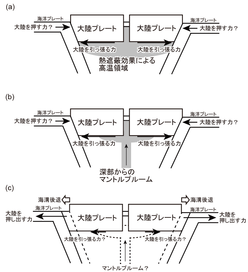 能動的分裂はさらに二つのメカニズムが考えられる。超大陸がマントルにとって毛布の役割を果たし、超大陸の直下がマントルの放射性発熱によってじわじわと高温になり、それに伴う水平方向の流れが超大陸を引き裂くというメカニズムである(図2a)。これは、超大陸の熱遮蔽効果、あるいは、毛布効果と呼ばれる。もう一つは、マントル深部からの上昇プルームが超大陸を引き裂くというメカニズムである(図2b)。一方、受動的メカニズムは、超大陸を取り囲む沈み込み帯(海溝)の後退によって超大陸(大陸プレート)と海洋プレートの間に隙間ができ、それを埋めるように、見かけ上、超大陸が海溝側に押されるように働く力が働いて、超大陸が引き裂かれるというメカニズムである(図2c)。以下に紹介する本研究の数値シミュレーションでは、毛布効果の役割について注目する。