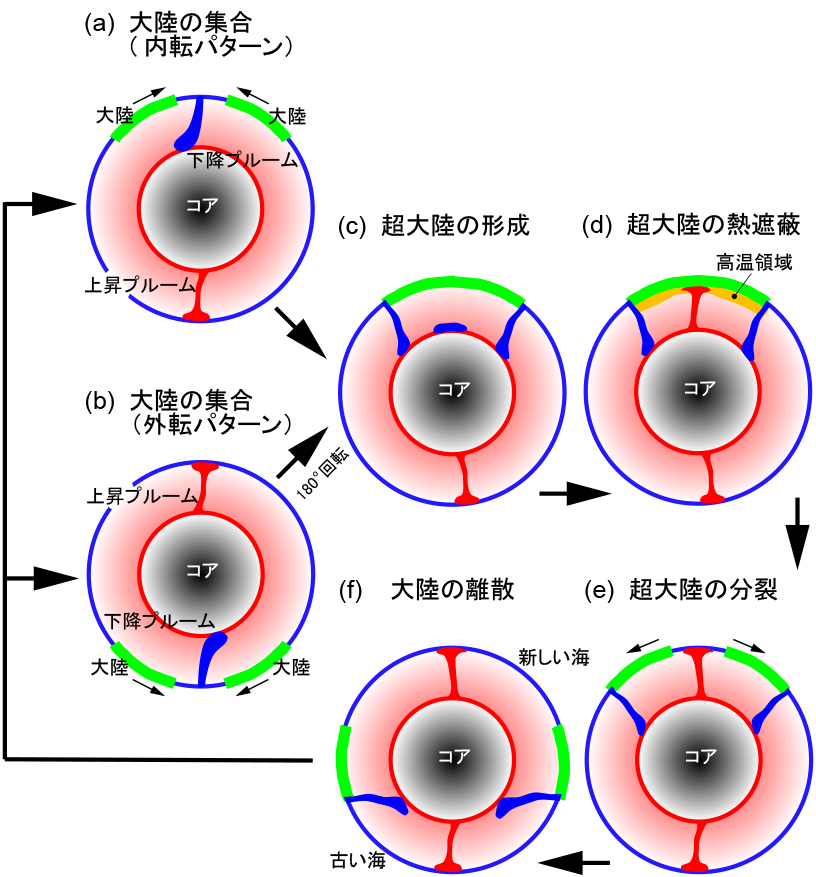 図1は超大陸サイクルのメカニズムを表している。(a)から(c)または(b)から(c)は大陸が下降プルーム(マントル下降流)に引き寄せられて集まり、超大陸が形成される様子を表している。(d)から(e)では、超大陸の熱遮蔽効果によって超大陸直下の高温領域の形成され、さらにマントル深部から上昇プルームが発生することによって超大陸が分裂する様子を表している。現在の地球の状態は大陸がもっともばらけた(f)に近く、古い海は太平洋、新しい海は大西洋に相当する。