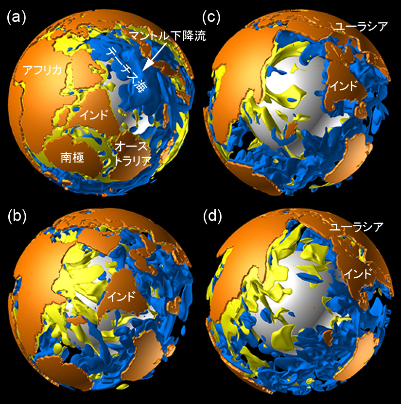 特に、パンゲアの分裂は超大陸の熱遮蔽効果(毛布効果)によるパンゲア直下のマントルの高温異常が大きく寄与することが分かった。これはパンゲアの下に溜まった熱を「裂け目」を作ることによりマントルから地表へ吐き出す必要があるためである。また、パンゲアの一部であったインド亜大陸の高速北進の主要な原動力は、パンゲア分裂直後からテーチス海北部に発達するマントル下降流(コールドプルーム)であることが明らかになった。そのマントル下降流(コールドプルーム)は、パンゲア直下のマントルの高温異常、及び、パンゲアの下(現在のアフリカ大陸の下)のマントル深部に元々存在していた大規模なホットプルームに励起されるマントルの大規模な流れによって、テーチス海北部のローラシア大陸の縁(大陸・海洋境界)に自発的に形成される。