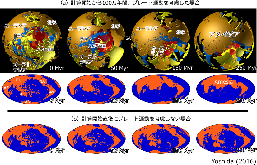 図1:数値シミュレーションの結果。(a)計算開始(現在)から100万年間、速度境界条件として現在のプレート運動を考慮した場合。左から現在、5000万年後、1億5000万年後、2億5000万年後。(b)計算開始直後に現在のプレート運動を考慮しなかった場合。
