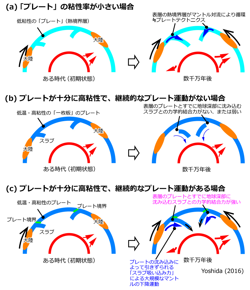 図2:地球表層運動とマントル対流との関係を示した概念図。(a)「プレート」の粘性が低い場合。「プレート」はマントル対流の熱境界層であるため、マントル対流により一緒に循環する。これはプレートテクトニクスではない。(b)プレートの粘性が高く「一枚板」のようになっている場合、継続的なプレート運動は起きない。(c)プレートの粘性が高く、プレート境界が存在する場合、実際の地球のように継続的なプレート運動が起きる。本研究のモデルでは、速度境界条件として実際の地球のプレート運動を与えるというアプローチで(c)の条件を再現している。この他、(c)の条件を再現するには実際の地球のプレート境界(収束・発散境界の分布)を与えれば良いが、厳密に実際の地球のプレート運動の方向と速度を再現することは難しい。図2cの「スラブ吸い込む力」は、図2a、bの条件では起こらない。