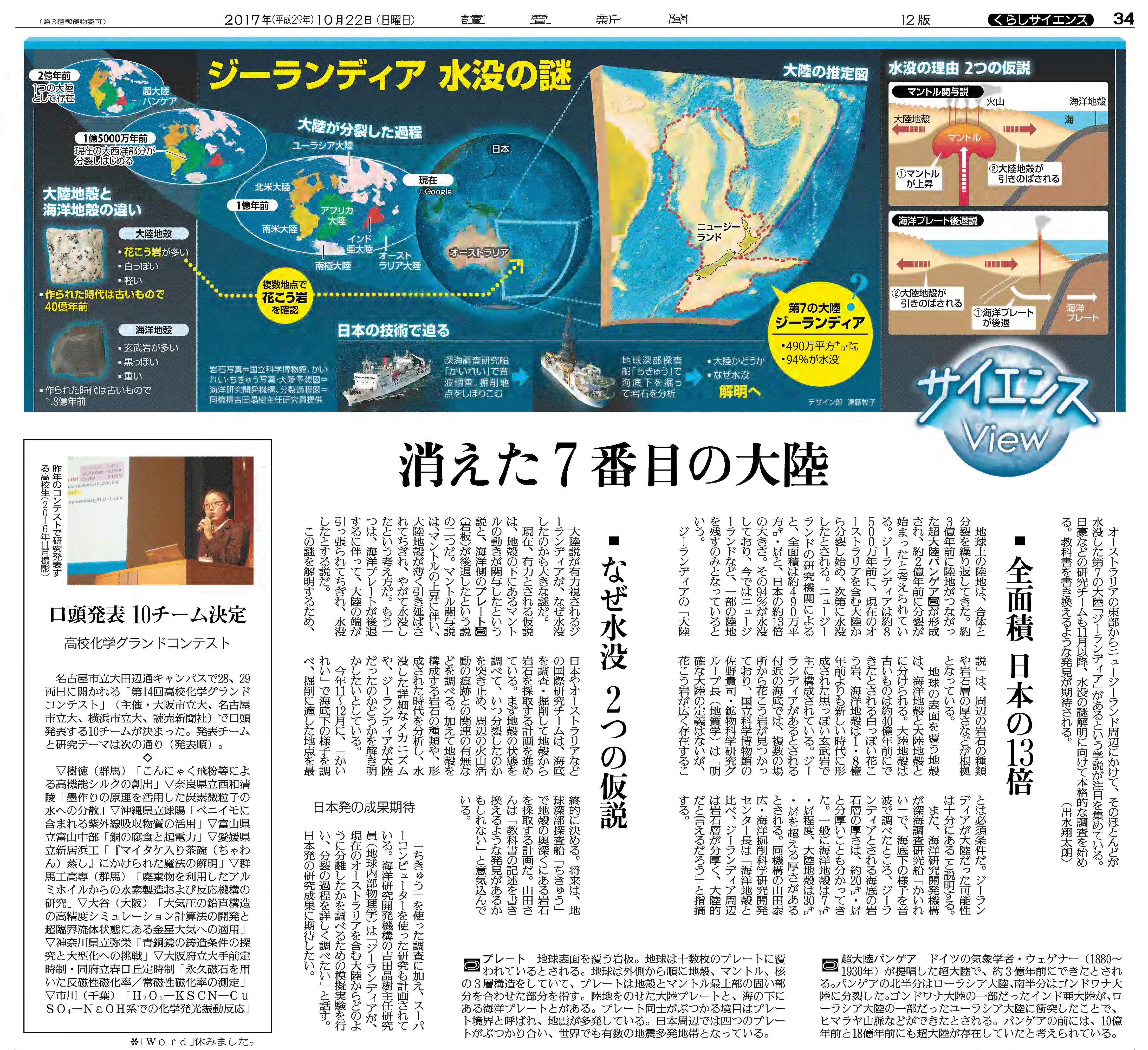 - 読売新聞朝刊, くらしサイエンス面「サイエンスView」, 「消えた7番目の大陸」, 2017年10月22日.