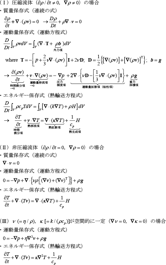 図1 マントルの熱対流運動を支配する基礎方程式。(Ⅰ)流体の圧縮性が考慮されている保存式。(Ⅱ)非圧縮流体の保存式。さらに(Ⅲ)運動量の拡散(つまり動粘性率)と熱の拡散(つまり熱拡散率)が空間的に一定と仮定した式。