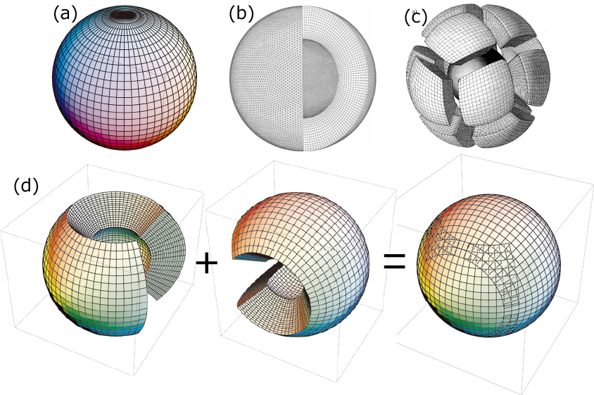 図2 マントル対流シミュレーションに用いられる計算格子の例。(a)緯度経度格子、(b)四面体有限要素格子[文献4]、(c)六面体有限要素格子[文献5]、(d)インヤン格子[文献3]。