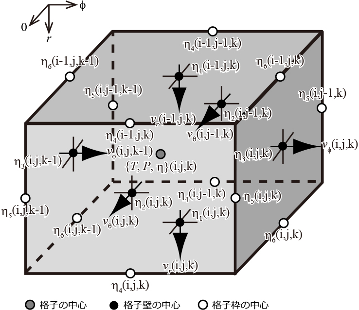 図3 スタッガード格子における速度三成分(v_r、v_θ、v_φ)、圧力(p)、温度(T)、粘性率(η)の各物理量の配置。温度、圧力、粘性率は格子の中心に、速度三成分は格子壁の中心に配置されている。有限体積法では、さらに、各格子壁の中心と各格子枠の中心に粘性率(η_1~η_6)を配置する必要がある。