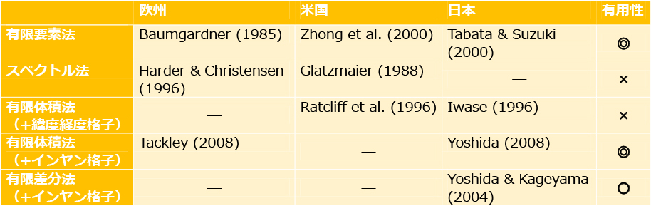 表1 これまで世界で開発されたマントル対流シミュレーションプログラムの離散化手法と、初出の論文(著者、西暦)を欧州、米国、日本別に分けている。
