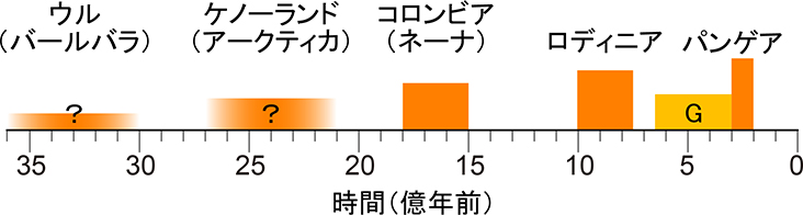 原生代初期の超大陸は異なる研究者によっていくつかの形が復元されている.北米大陸東岸のクラトンとバルティカのクラトンの地質構造の類似性をもとに復元された超大陸はヌーナ(Nuna)と呼ばれ,これに東南極のクラトンを含んだ超大陸はネーナ(Nena)と呼ばれている.さらに,20億年前に形成された世界の造山帯に注目し,パズル合わせのように世界の大陸をひとまとまりに復元した超大陸はコロンビア(Columbia)と名付けられている[文献2、3].コロンビアは約19億年前から17億年前に形成され,約15億年前に分裂が始まったとされている(図1).