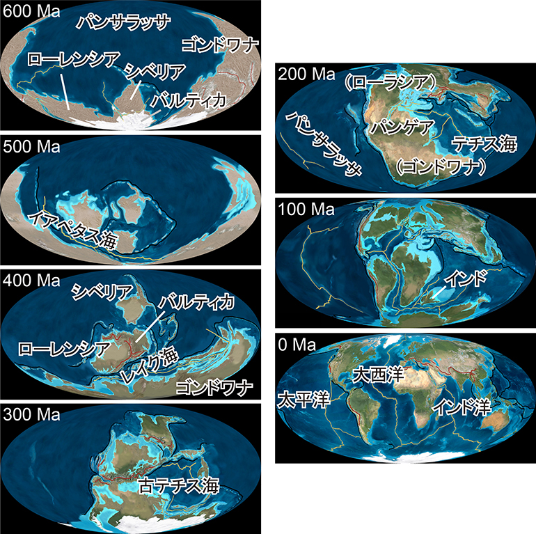 6億年前の原生代後期には,ロディニアから分裂したゴンドワナ(Gondwana),ローレンシア,シベリア,バルティカの各大陸があった.5億年前の古生代カンブリア紀になると,ローレンシア,バルティカ,ゴンドワナの間にイアペタス海(Iapetas Ocean)と呼ばれる新しい海が誕生した.4億年前のデボン紀には,シベリア,バルティカが北上し,バルティカはローレンシアと合体した.ゴンドワナとローレンシア,シベリアの間にはそれぞれ,レイク海(Rheic Ocean)と古テチス海(Paleo- Tethys Ocean)と呼ばれる新しい海ができ,この頃までにイアペタス海は消滅した.3億年前の石炭紀になると,シベリア,ローレンシアはさらに北上し,また,当初東半球と西半球にまたいで存在していたゴンドワナは南に約90度移動して南半球に位置するようになり,南北に延びる超大陸パンゲア(Pangea)の原形ができ始めた(図2).
