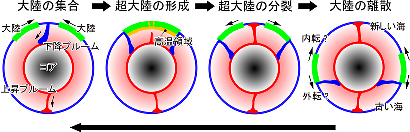 超大陸の分裂が起こる原因として考えられるのは,超大陸の熱遮蔽効果とマントル深部からの上昇プルームである[文献5].前者は,時間を掛けて超大陸の下に溜まった熱が超大陸を水平方向に引き裂いて逃げようとすることで起こる.後者は超大陸の縁辺から沈み込んだプレートがマントル深部まで落下したときに,それを補償するように超大陸の下に上昇プルームが発生し,これが超大陸を引き裂くことで起こる(図3).また,超大陸の縁辺で沈み込むプレートが後退(つまり,海溝が後退)し,海溝の海側に超大陸が押し出される力が働くことで,受動的に分裂するという考え方もある.