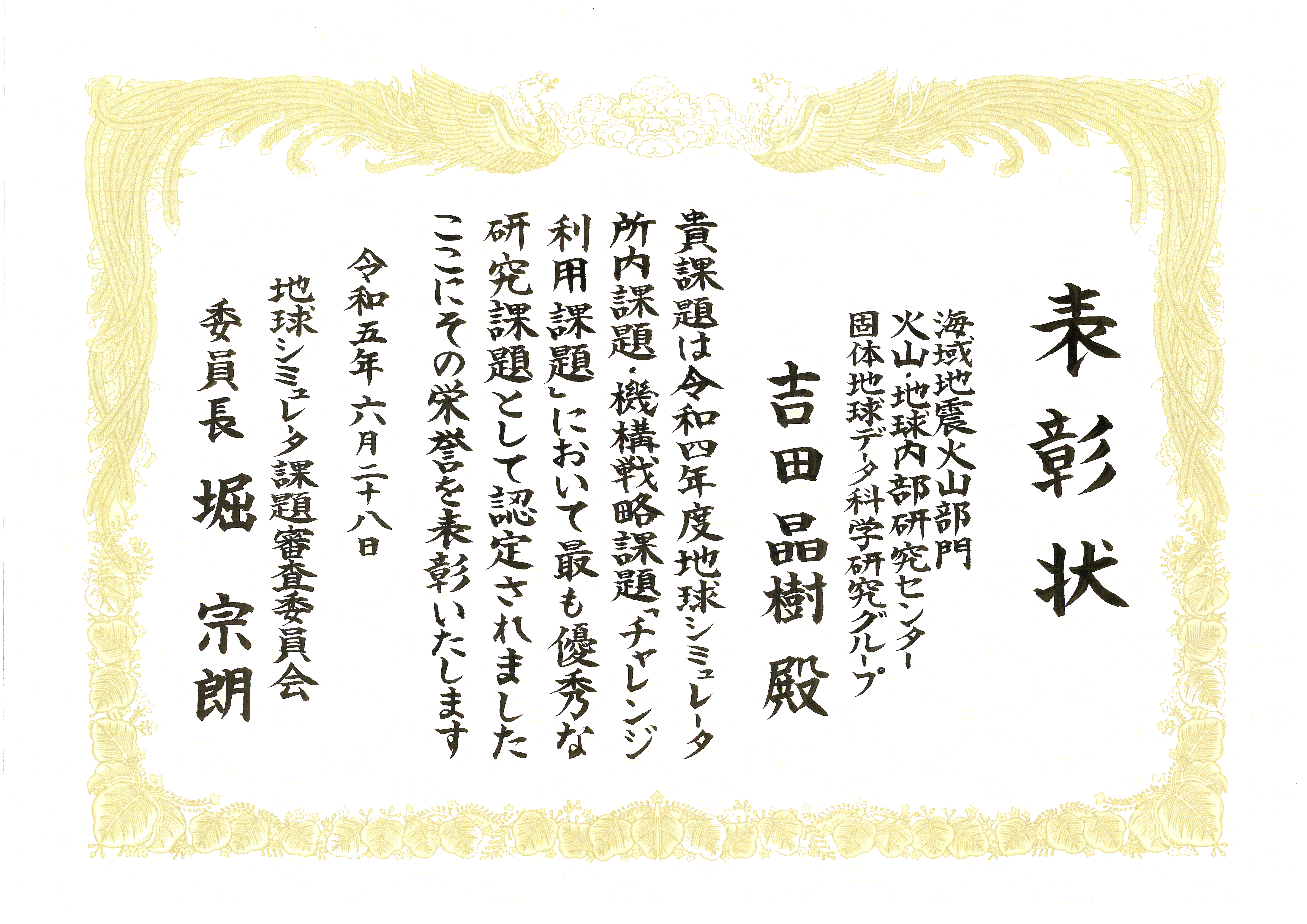 - 国立研究開発法人海洋研究開発機構 令和4年度ES(地球シミュレータ)利用課題表彰 | 賞状 |