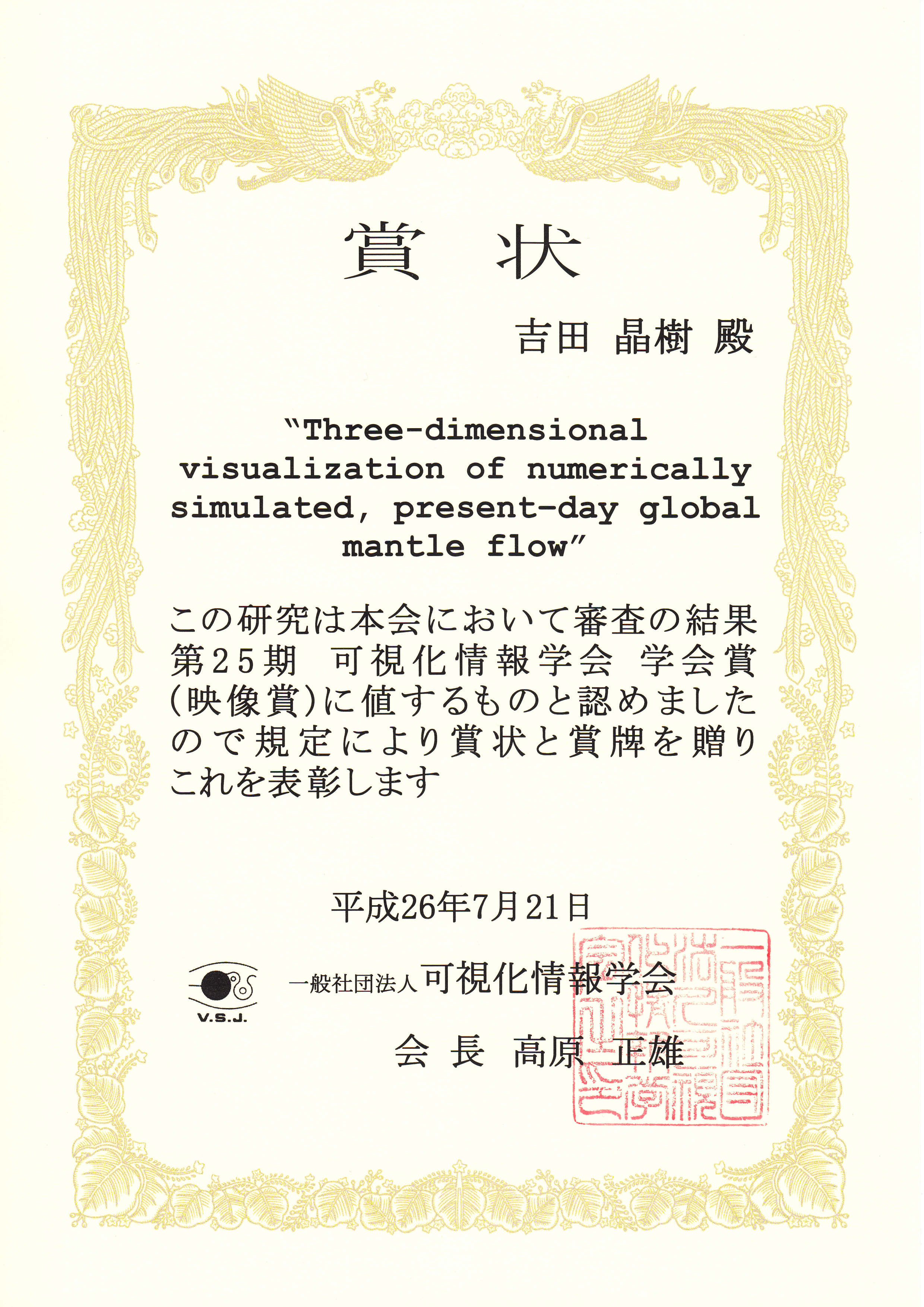 - 社団法人可視化情報学会 第25期(平成25年度)学会賞(映像賞) | 賞状 |