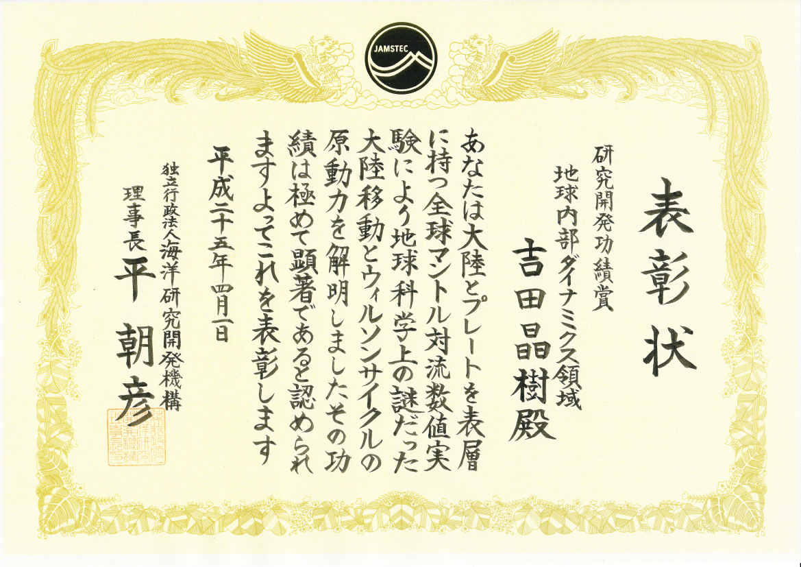 - 独立行政法人海洋研究開発機構 平成24年度業績表彰(研究開発功績賞) | 賞状 |